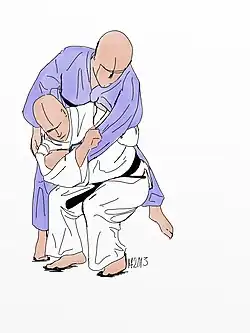 Tori (« celui qui saisit » et donc qui exécute la technique) et Uke (« celui qui reçoit » la technique) sont face à face en judogi. Ils se saisissent l'un l'autre en décroisé, les mains positionnées pouces vers le haut. Une main est placée pouce à l'intérieur du judogi sous le revers et les quatre autres doigts placés à l'extérieur sur le revers fermant la saisie. L'autre entièrement à l'extérieur du judogi sur le côté extérieur de la manche saisie par le milieu.
