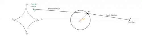 L'opérateur choisit de placer le point P, et peut le déplacer comme il l'entend. Sur la figure ci-contre, la forme ABCD entoure les positions de P pour lesquelles le point M connaît deux positions stables de part et d'autre de l'axe (OF), soit deux valeurs stables pour θ. Si le point P sort de cette figure, une seule position est stable pour M. La forme en diamant ABCD elle-même marque les positions de P pour lesquelles de petites perturbations de position entraînent de larges changements pour θ : ce sont des bifurcations[5].