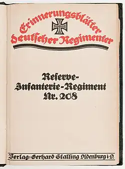 Erinnerungsblätter deutscher Regimenter est une série de livres publiés après la fin de la Première Guerre mondiale jusque dans les années 1940. Chaque volume décrit l'histoire opérationnelle d'un régiment ou d'un bataillon indépendant de l'armée de l'Empire allemand pendant la guerre mondiale. Au total, 1 250 volumes sont publiés[1]. Les Erinnerungsblätter paraissent en quatre parties régionales avec une numérotation consécutive distincte pour les unités prussienne, bavaroise, saxonne et wurtembergeoise. Cette dernière série régionale s'intitule Die württembergischen Regimenter im Weltkrieg.