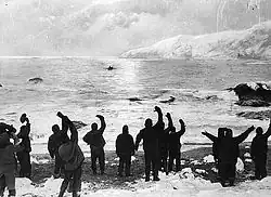 Pendant près de deux mois Shackleton et son équipe campent sur la banquise, espérant qu'elle dérive vers l'île Paulet, au nord, à près de 400 km de là, car ils savent que des provisions y sont déposées[84] pour les naufragés du voilier L'Antarctic depuis douze ans[10]. Après avoir échoué à cette dangereuse entreprise, à cause de la dérive qui les en éloigne, Shackleton décide de monter un autre camp (Patience Camp) sur cette banquise mouvante, se fiant à nouveau au courant qui la pousse vers le détroit de Drake, au nord. Il veut dériver vers les eaux libres pour mettre les canots à la mer et atteindre une île de l'extrémité de la péninsule Antarctique. Le 17 mars, leur camp est à moins de 100 km de l'île Paulet[85], mais la glace trop épaisse les en sépare. Ils ne peuvent l'atteindre. Le 9 avril, leur banquise se brise. Shackleton ordonne alors à l'équipage de mettre les canots à la mer et de naviguer vers la terre la plus proche[86]. Après cinq jours et cinq nuits sur une mer agitée et glaciale, les hommes, épuisés, débarquent à l'île de l'Éléphant[87], roche escarpée et couverte de glaces. La préoccupation de Shackleton pour ses hommes est telle qu'il donne ses mitaines au photographe de l'expédition Frank Hurley, qui avait perdu les siennes. Shackleton en aura quelques doigts gelés.