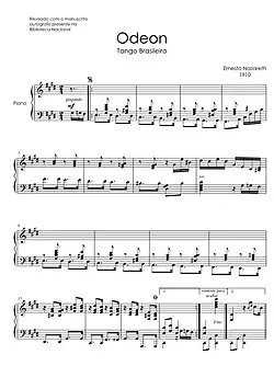 Ernesto Nazareth a entendu les sons provenant de la rue, joués par nos musiciens populaires, et les a accompagné au piano, leur donnant une tenue raffinée. Ainsi, son travail se situe à la frontière du populaire avec l'érudit, se déplaçant librement entre les deux zones. Il n'est nullement hors de propos s'il est interprété par un concertiste ou un chorão comme Jacob do Bandolim, l'esprit du choro sera toujours présent. Et c'est cet esprit, cette synthèse de la musique choro elle-même, qui marque la série de ses près d'une centaine de tangos brésiliens, à laquelle appartient "Odéon".