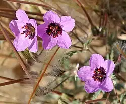 L'inflorescence est une ombelle lâche constituée de 2 à 8 fleurs. Les fleurs, roses plus ou moins mauve (pouvant tirer vers le rouge ou vers le blanc), ont 5 sépales velus, verts, de 3 à 5 mm de longueur, et 5 pétales, ces derniers étant souvent inégaux. Elles ont un diamètre variant de 4 à 13 mm[6],[4]. Elles possèdent 5 étamines qui alternent avec cinq staminodes ressemblant à des écailles. L'ovaire présente 5 lobes, correspondant à 5 carpelles. La placentation est axile. L'ovaire est surmonté de 5 styles fusionnés, longs de 2 à 5 cm et surmontés de 5 stigmates libres[3],[8].