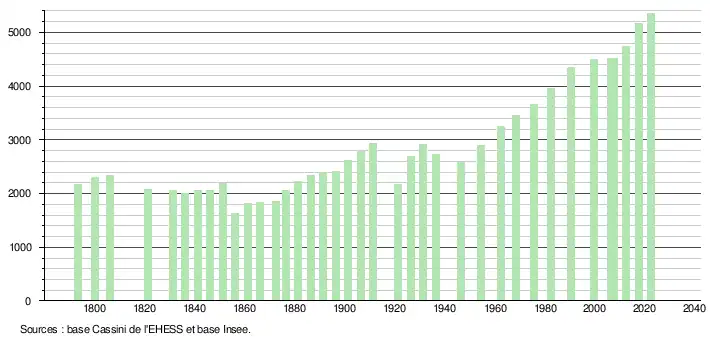 L'évolution du nombre d'habitants est connue à travers les recensements de la population effectués dans la commune depuis 1793. Pour les communes de moins de 10 000 habitants, une enquête de recensement portant sur toute la population est réalisée tous les cinq ans, les populations de référence des années intermédiaires étant quant à elles estimées par interpolation ou extrapolation[34]. Pour la commune, le premier recensement exhaustif entrant dans le cadre du nouveau dispositif a été réalisé en 2007[35].