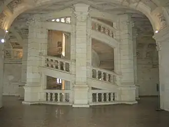 L'escalier du château de Chambord - (de 157 marches) qui pourrait avoir été construit sur la base de dessins de Léonard de Vinci[14] - a la particularité d'être constitué de deux escaliers en un. Les deux hélices sont imbriquées l'une dans l'autre et ne se croisent pas. Une personne peut donc descendre et une autre monter sans jamais se croiser. En revanche un jeu d'ouverture permet de s'apercevoir de l'un à l'autre. Les éléments architecturaux de cet escalier sont inspirés de l'escalier du château de Blois.