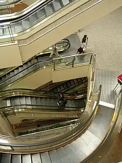 Les magasins et supermarchés à deux ou trois niveaux relient ceux-ci par des escaliers roulants, pouvant conjointement être équipés aussi de travelators pour les caddies.
