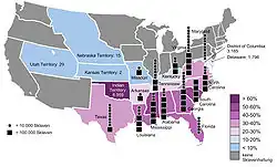 - (en) « Carte montrant la distribution des esclaves dans les treize États du Sud des États-Unis selon le recensement de 1860 » [PDF], sur census.gov (consulté le ).