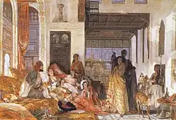 Les fameux harems ont stimulé les imaginations des commentateurs, des peintres et des poètes, mais ces femmes asservies dans un but érotique étaient en fait moins maltraitées que celles vouées aux travaux domestiques ou agricoles. Ces jâriyat (concubines) des harems ont en pratique un statut comparable à des épouses libres : celles des harems impériaux deviennent même très influentes sur le pouvoir ottoman[45]. Lorsqu'une jâriyat mettait au monde le fils d'un maître musulman, elle était émancipée en tant que mère d'un enfant né musulman, ce qui la rendait honorable[46]. En effet, la loi coranique limite aux non-musulmans la notion de « bâtardise », en reconnaissant comme musulmans libres les enfants d'un maître musulman même si l'autre parent est esclave et/ou non-musulman[30],[46]. Pour cette raison, le prix d'une esclave féminine destinée à devenir concubine, était bien plus élevé que celui d'un homme ou d'une femme destinée aux travaux.