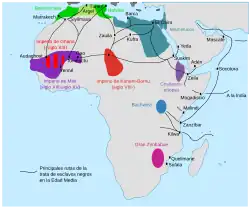 Avec l'avancée de l'islam, l'esclavage se développe. Dès le VIIe siècle, sans parler de conquêtes, les premiers raids arabes dans le Sahara approvisionnent les marchés aux esclaves. Au XIe siècle, le trafic caravanier augmente et les chefs de tribus africaines se convertissent. En 1077, Abu Bakr Ibn Omar lance une expédition sanguinaire au Ghana. Mais les Berbères Almoravides du Maroc n'arrivent pas à s'installer durablement. En 1222, Sundjata Keïta abolit l'esclavage en créant l'empire du Mali (Charte du Manden).