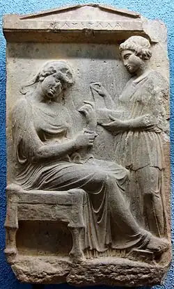 La pratique de l’affranchissement est attestée à Chios dès le VIe siècle[41]. Il est probable qu’elle remonte à l’époque archaïque, la procédure se faisant alors par oral. Des affranchissements informels sont également attestés à la période classique : il suffit de s’assurer des témoins, ce qui conduit des citoyens à affranchir leur esclave en pleine représentation théâtrale ou en pleine délibération du tribunal[42]. La chose sera au reste interdite à Athènes au milieu du VIe siècle, pour éviter des troubles à l’ordre public.