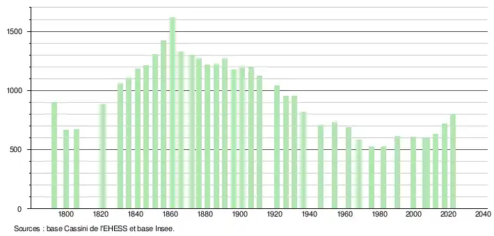 L'évolution du nombre d'habitants est connue à travers les recensements de la population effectués dans la commune depuis 1793. Pour les communes de moins de 10 000 habitants, une enquête de recensement portant sur toute la population est réalisée tous les cinq ans, les populations de référence des années intermédiaires étant quant à elles estimées par interpolation ou extrapolation[26]. Pour la commune, le premier recensement exhaustif entrant dans le cadre du nouveau dispositif a été réalisé en 2007[27].