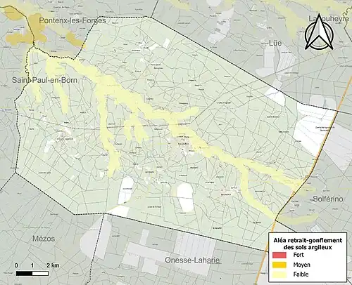 Le retrait-gonflement des sols argileux est susceptible d'engendrer des dommages importants aux bâtiments en cas d’alternance de périodes de sécheresse et de pluie. Aucune partie du territoire de la commune n'est en aléa moyen ou fort (19,2 % au niveau départemental et 48,5 % au niveau national). Sur les 451 bâtiments dénombrés sur la commune en 2019, aucun n'est en aléa moyen ou fort, à comparer aux 17 % au niveau départemental et 54 % au niveau national. Une cartographie de l'exposition du territoire national au retrait gonflement des sols argileux est disponible sur le site du BRGM[20],[Carte 2].