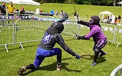 - auprès d'associations de recherche vouées aux arts martiaux historiques européens (AMHE), où seul l'aspect technique compte, avec un maximum de rigueur, les assauts étant effectués en tenues de protection moderne, et pouvant être pratiqués aussi de manière compétitive ;
