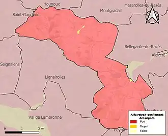 Le retrait-gonflement des sols argileux est susceptible d'engendrer des dommages importants aux bâtiments en cas d’alternance de périodes de sécheresse et de pluie. La totalité de la commune est en aléa moyen ou fort (75,2 % au niveau départemental et 48,5 % au niveau national). Sur les 135 bâtiments dénombrés sur la commune en 2019, 135 sont en aléa moyen ou fort, soit 100 %, à comparer aux 94 % au niveau départemental et 54 % au niveau national. Une cartographie de l'exposition du territoire national au retrait gonflement des sols argileux est disponible sur le site du BRGM[23],[Carte 3].