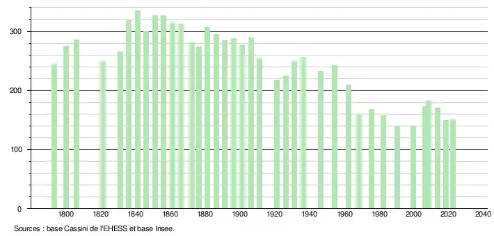 L'évolution du nombre d'habitants est connue à travers les recensements de la population effectués dans la commune depuis 1793. Pour les communes de moins de 10 000 habitants, une enquête de recensement portant sur toute la population est réalisée tous les cinq ans, les populations de référence des années intermédiaires étant quant à elles estimées par interpolation ou extrapolation[26]. Pour la commune, le premier recensement exhaustif entrant dans le cadre du nouveau dispositif a été réalisé en 2008[27].