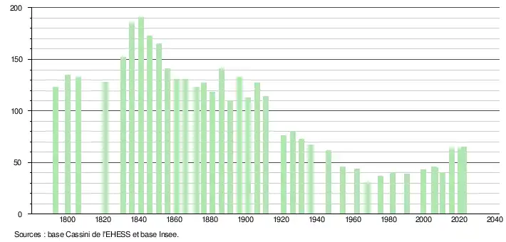 L'évolution du nombre d'habitants est connue à travers les recensements de la population effectués dans la commune depuis 1793. Pour les communes de moins de 10 000 habitants, une enquête de recensement portant sur toute la population est réalisée tous les cinq ans, les populations de référence des années intermédiaires étant quant à elles estimées par interpolation ou extrapolation[16]. Pour la commune, le premier recensement exhaustif entrant dans le cadre du nouveau dispositif a été réalisé en 2005[17].