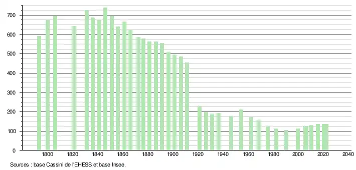 L'évolution du nombre d'habitants est connue à travers les recensements de la population effectués dans la commune depuis 1793. Pour les communes de moins de 10 000 habitants, une enquête de recensement portant sur toute la population est réalisée tous les cinq ans, les populations de référence des années intermédiaires étant quant à elles estimées par interpolation ou extrapolation[17]. Pour la commune, le premier recensement exhaustif entrant dans le cadre du nouveau dispositif a été réalisé en 2005[18].