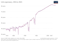 En 1800, l'espérance de vie à la naissance en France était de 32 ans. En 1900, elle passe à 50 ans[5],[6].