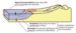 Dans les milieux marins, les changements d'accommodation sur de longues échelles de temps sont principalement déterminés par la tectonique et par les variations eustatiques[3].