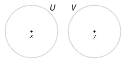 - X est séparé si et seulement si, pour tout point x de X, l'intersection des voisinages fermés de x est réduite au singleton {x} (ce qui entraine la séparation T1 : l'intersection de tous les voisinages de x est réduite au singleton).
