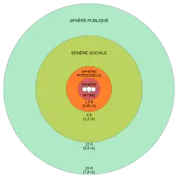 L'espace vital en psychologie est en général scindé en trois espaces concentriques centrés autour de la personne.