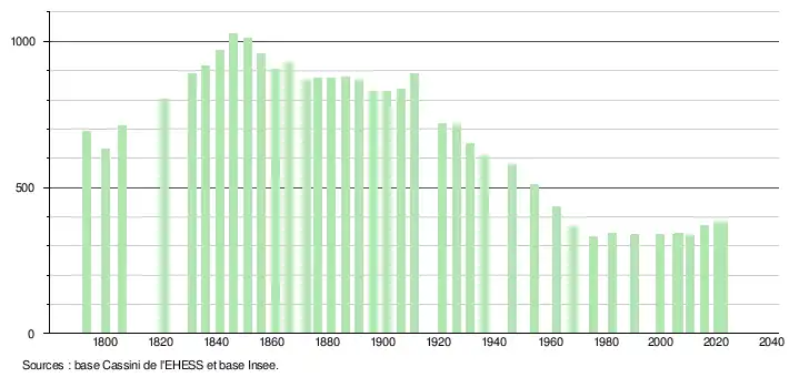 L'évolution du nombre d'habitants est connue à travers les recensements de la population effectués dans la commune depuis 1793. Pour les communes de moins de 10 000 habitants, une enquête de recensement portant sur toute la population est réalisée tous les cinq ans, les populations de référence des années intermédiaires étant quant à elles estimées par interpolation ou extrapolation[23]. Pour la commune, le premier recensement exhaustif entrant dans le cadre du nouveau dispositif a été réalisé en 2005[24].