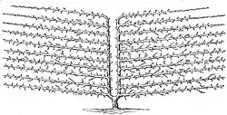 - la palmette double : tronc divisé en deux branches charpentières verticales rapprochées, d'où partent de multiples sous-charpentières horizontales.