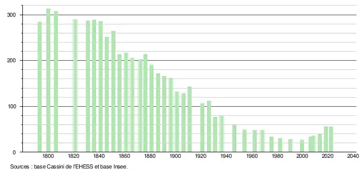 L'évolution du nombre d'habitants est connue à travers les recensements de la population effectués dans la commune depuis 1793. Pour les communes de moins de 10 000 habitants, une enquête de recensement portant sur toute la population est réalisée tous les cinq ans, les populations de référence des années intermédiaires étant quant à elles estimées par interpolation ou extrapolation[21]. Pour la commune, le premier recensement exhaustif entrant dans le cadre du nouveau dispositif a été réalisé en 2008[22].