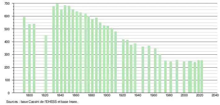 | L'évolution du nombre d'habitants est connue à travers les recensements de la population effectués dans la commune depuis 1793. Pour les communes de moins de 10 000 habitants, une enquête de recensement portant sur toute la population est réalisée tous les cinq ans, les populations de référence des années intermédiaires étant quant à elles estimées par interpolation ou extrapolation[26]. Pour la commune, le premier recensement exhaustif entrant dans le cadre du nouveau dispositif a été réalisé en 2008[27]. En 2022, la commune comptait 254 habitants[Note 4], en évolution de +3,67 % par rapport à 2016 (Tarn-et-Garonne : +3,12 %, France hors Mayotte : +2,11 %). |