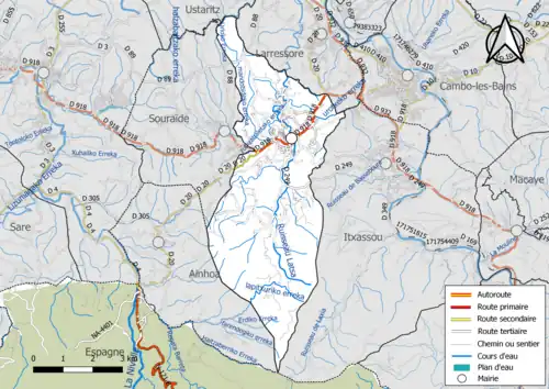 Située dans le bassin versant de l'Adour, la commune est traversée[14] par le ruisseau Latsa (ainsi que son affluent, le ruisseau de Zubizabaleta et le tributaire de ce dernier, le ruisseau de Mandopixa) et le ruisseau d' Urotxe (affluents de la Nive).