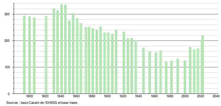 L'évolution du nombre d'habitants est connue à travers les recensements de la population effectués dans la commune depuis 1793. Pour les communes de moins de 10 000 habitants, une enquête de recensement portant sur toute la population est réalisée tous les cinq ans, les populations de référence des années intermédiaires étant quant à elles estimées par interpolation ou extrapolation[33]. Pour la commune, le premier recensement exhaustif entrant dans le cadre du nouveau dispositif a été réalisé en 2006[34].