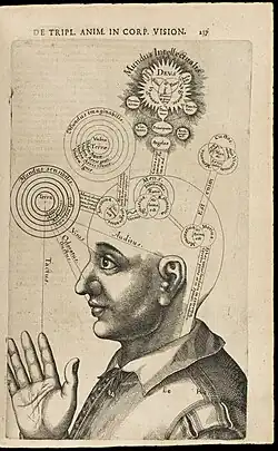 Sous le couvert de l'alchimie, de l'hermétisme ou de la kabbale, de nombreux savants pratiquent une connaissance ésotérique, recueillie notamment par la Rose-Croix. Pour le rosicrucien Robert Fludd (1574-1637), l'esprit, également appelé « sperma intellectuale », était traité dans les testicules du cerveau et éjecté par le pénis[Note 2],[25], c'est-à-dire la glande pinéale. Cet esprit une fois purifié était le porteur direct de la lumière de la capacité de comprendre, c'est-à-dire de l'intellect. Fludd trouve des formulations qui décrivent la glande pinéale comme une sorte de siège de l'anima mundi[26]. Dans leurs théories de la nature, les philosophes présocratiques utilisaient couramment le sperma (la semence) en métaphore de l'origine d’existence matérielle ou quantitative. Sœur doctrinale de la pneuma, le λόγοι σπερματικοὶ / logoi spermatikoi, se trouve dans la philosophie hellénistique des stoïciens (à partir du IVe siècle av. J.-C.). Spiritualisées par Plotin en Rationes séminales (en), reprises par Saint Augustin, elle ne se retrouve véritablement que sous la plume des alchimistes médiévaux, puis de Paracelse (et Marsile Ficin) pour gagner le monde médical[27]. Chez le philosophe Sylvain Matton on peut lire, que pour Marsile Ficin, l’âme, « est toujours et nécessairement liée à un corpus proximum, corps quasi-immatériel, quasi non-corps, corps éthéré », « esprit » (spiritus) qui constitue le « vêtement » de l’âme, son « idole » ou son « véhicule », et« lui sert d’intermédiaire avec le corps élémentaire ainsi que d’instrument pour agir sur lui, soit directement, soit par l’intermédiaire d’autres véhicules plus corporels, comme les esprits animaux »[28].