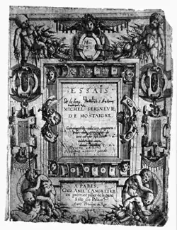 Les Essais est l'œuvre majeure de Michel de Montaigne ; elle fut publiée pour la première fois en 1580. L’œuvre traite de nombre de sujets, sans ordre apparent : médecine, arts, livres, affaires domestiques, histoire ancienne, chevaux, maladie[n 1] entre autres, auxquels Montaigne mêle des réflexions sur sa propre vie et sur l'Homme, le tout formant « un pêle-mêle où se confondent comme à plaisir les choses importantes et futiles, les côtés vite surannés et l’éternel[1]. » Les Essais se composent de 3 tomes (ou livres) contenant en tout 107 chapitres.