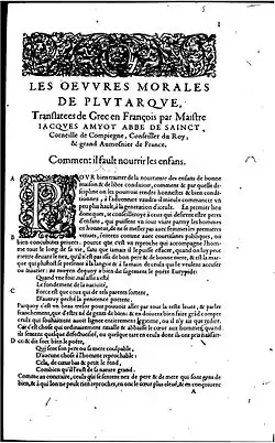 Michel de Montaigne possède un exemplaire de l'édition de 1565 des Vies parallèles traduites par Amyot[5]. Il fait l'éloge du traducteur dans ses Essais[6], comme il loue Plutarque à plusieurs reprises. La lecture des Vies parallèles donne à Montaigne l'inspiration de plusieurs Essais, au fil d'emprunts plus ou moins conscients pour lesquels il parle de « transplantation ». Plutarque, qui reste l'auteur le plus fréquemment cité dans l'ouvrage, y est « omniprésent »[7]. L'humaniste recherche dans les Vies parallèles plus les jugements du moraliste que la science historique[8], car il considère que l'histoire des événements, tributaire de la Fortune, est particulièrement difficile à établir et à attester, et reste par nature inférieure à l'histoire des vies[8].