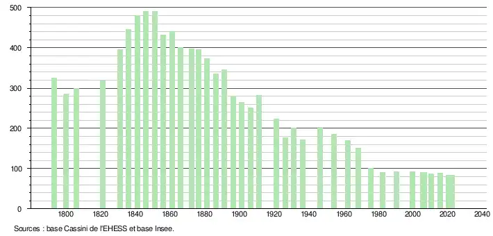 L'évolution du nombre d'habitants est connue à travers les recensements de la population effectués dans la commune depuis 1793. Pour les communes de moins de 10 000 habitants, une enquête de recensement portant sur toute la population est réalisée tous les cinq ans, les populations de référence des années intermédiaires étant quant à elles estimées par interpolation ou extrapolation[19]. Pour la commune, le premier recensement exhaustif entrant dans le cadre du nouveau dispositif a été réalisé en 2005[20].