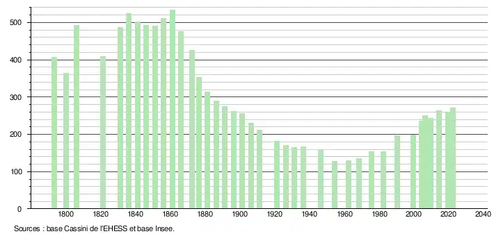 L'évolution du nombre d'habitants est connue à travers les recensements de la population effectués dans la commune depuis 1793. Pour les communes de moins de 10 000 habitants, une enquête de recensement portant sur toute la population est réalisée tous les cinq ans, les populations de référence des années intermédiaires étant quant à elles estimées par interpolation ou extrapolation[32]. Pour la commune, le premier recensement exhaustif entrant dans le cadre du nouveau dispositif a été réalisé en 2004[33].