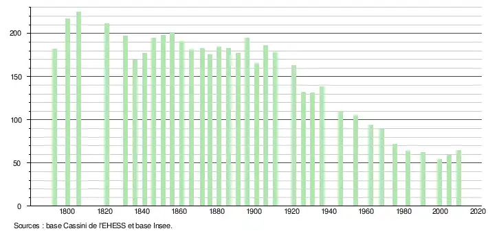 - ↑ Par convention dans Wikipédia, le principe a été retenu de n’afficher dans le tableau des recensements et le graphique, pour les populations légales postérieures à 1999, que les populations correspondant à une enquête exhaustive de recensement pour les communes de moins de 10 000 habitants, et que les populations des années 2006, 2011, 2016, etc. pour les communes de plus de 10 000 habitants, ainsi que la dernière population légale publiée par l’Insee pour l'ensemble des communes.