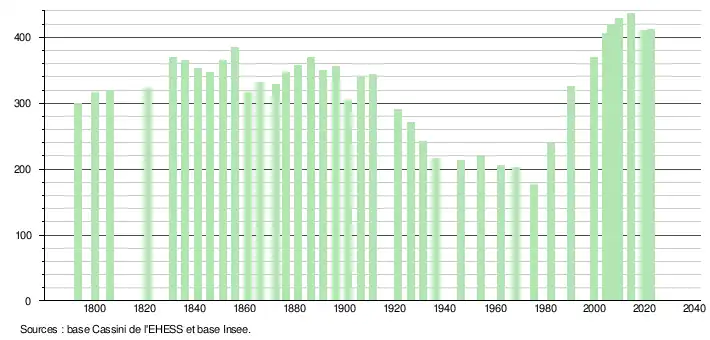 L'évolution du nombre d'habitants est connue à travers les recensements de la population effectués dans la commune depuis 1793. Pour les communes de moins de 10 000 habitants, une enquête de recensement portant sur toute la population est réalisée tous les cinq ans, les populations de référence des années intermédiaires étant quant à elles estimées par interpolation ou extrapolation[23]. Pour la commune, le premier recensement exhaustif entrant dans le cadre du nouveau dispositif a été réalisé en 2004[24].