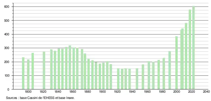 L'évolution du nombre d'habitants est connue à travers les recensements de la population effectués dans la commune depuis 1793. Pour les communes de moins de 10 000 habitants, une enquête de recensement portant sur toute la population est réalisée tous les cinq ans, les populations de référence des années intermédiaires étant quant à elles estimées par interpolation ou extrapolation[21]. Pour la commune, le premier recensement exhaustif entrant dans le cadre du nouveau dispositif a été réalisé en 2007[22].