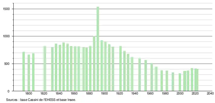 L'évolution du nombre d'habitants est connue à travers les recensements de la population effectués dans la commune depuis 1793. Pour les communes de moins de 10 000 habitants, une enquête de recensement portant sur toute la population est réalisée tous les cinq ans, les populations de référence des années intermédiaires étant quant à elles estimées par interpolation ou extrapolation[27]. Pour la commune, le premier recensement exhaustif entrant dans le cadre du nouveau dispositif a été réalisé en 2005[28].