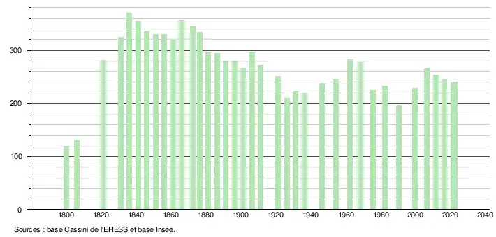 L'évolution du nombre d'habitants est connue à travers les recensements de la population effectués dans la commune depuis 1800. Pour les communes de moins de 10 000 habitants, une enquête de recensement portant sur toute la population est réalisée tous les cinq ans, les populations de référence des années intermédiaires étant quant à elles estimées par interpolation ou extrapolation[33]. Pour la commune, le premier recensement exhaustif entrant dans le cadre du nouveau dispositif a été réalisé en 2006[34].