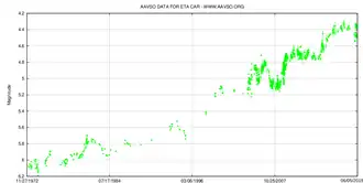 Entre 1900 et au moins 1940, Eta Carinae semblait s'être stabilisée à une luminosité constante autour de la magnitude 7,6[2], mais en 1953 une remontée de sa luminosité, jusqu'à la magnitude 6,5, est mise en évidence[36]. L'augmentation de son éclat se poursuivit régulièrement, mais avec des variations relativement régulières de quelques dixièmes de magnitude[8].