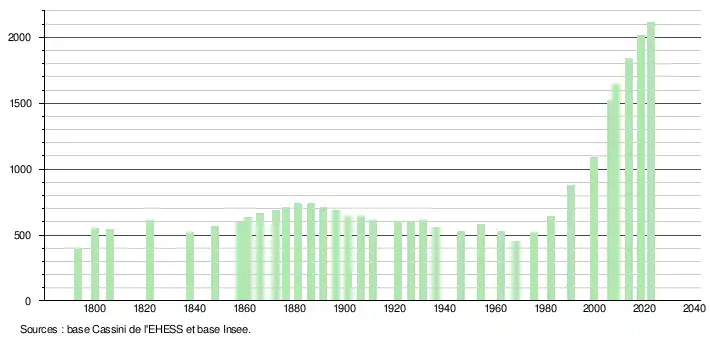 L'évolution du nombre d'habitants est connue à travers les recensements de la population effectués dans la commune depuis 1793. Pour les communes de moins de 10 000 habitants, une enquête de recensement portant sur toute la population est réalisée tous les cinq ans, les populations de référence des années intermédiaires étant quant à elles estimées par interpolation ou extrapolation[17]. Pour la commune, le premier recensement exhaustif entrant dans le cadre du nouveau dispositif a été réalisé en 2008[18].