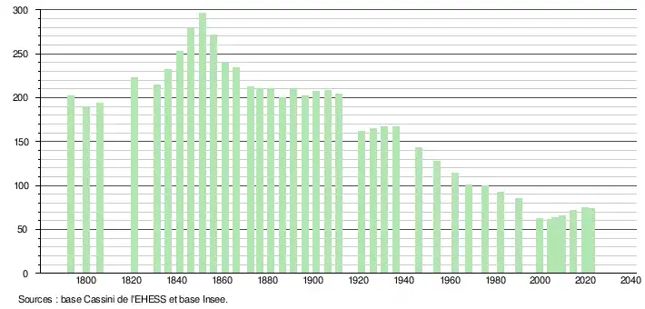 L'évolution du nombre d'habitants est connue à travers les recensements de la population effectués dans la commune depuis 1793. Pour les communes de moins de 10 000 habitants, une enquête de recensement portant sur toute la population est réalisée tous les cinq ans, les populations de référence des années intermédiaires étant quant à elles estimées par interpolation ou extrapolation[46]. Pour la commune, le premier recensement exhaustif entrant dans le cadre du nouveau dispositif a été réalisé en 2004[47].
