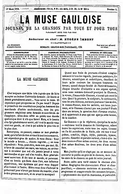 La Muse Gauloise, Journal de la chanson par tous et pour tous, numéro 1, 1er mars 1863. Rédacteur en chef: Eugène Imbert[8].