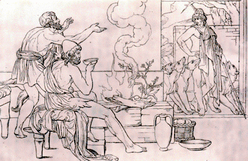 Laërte, roi d'Ithaque, est le père d'Ulysse. Il vivait encore au retour d'Ulysse à Ithaque et l'aida, avec Eumée, à reprendre possession de son royaume. Plus précisément, Ulysse, à son retour, se présente déguisé en mendiant à Eumée, qui le reçoit chaleureusement. C'est dans sa cabane qu'Ulysse révèle à son fils Télémaque sa véritable identité. Le porcher aidera ensuite Ulysse à vaincre les prétendants de son épouse Pénélope, dans la grande salle du palais royal d'Ithaque.