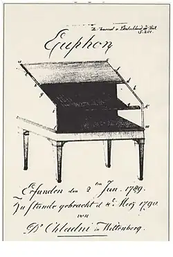 « Des imitateurs se hâtèrent de marcher sur ses traces et d’exploiter son idée. Ainsi parurent le Terpodion, le Mélodion, le Panmélodion, tous basés sur le même principe que l’Euphone. Tandis que les uns applaudissaient aux efforts de Chladni, que les autres exploitaient sa découverte à leur profits, lui-même il songeait sans cesse au moyen d’améliorer le mécanisme de l’instrument, dont, naturellement, les effets était plus curieux que suaves. Le clavicylindre, qui n’est point, on doit le voir par ce qui précède, un euphone perfectionné, quoique le désir de perfectionner l’euphone ait mis Chladni sur la voie, offrait la même forme qu’un piano carré ; mais ses dimensions sont moindres (...) Les sons approchent, quant aux timbres et à la qualité, de ceux de l’harmonica ; mais ils ont l’avantage de ne pas exciter d’irritation dans le système nerveux. »
