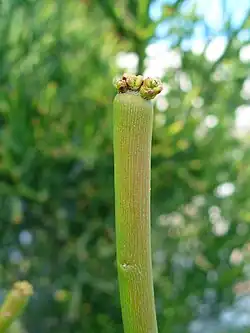 Les tiges sont vert foncé, ramifiées, à rameaux opposés ou alternes. Les branches terminales sont cylindriques, glabres, d’un vert plus clair, jusqu’à 7 mm de diamètre, sub-verticillées, formant des masses en forme de brosse qui sont la caractéristique la plus connue de cette espèce. La plante ne porte pas d’épines.