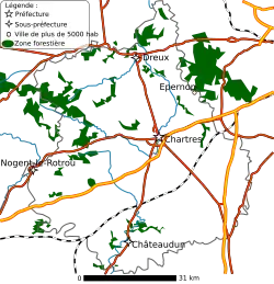 La forêt, avec près 75 000 hectares (appartenant à 80 % au domaine privé et 10 000 de forêts domaniales[2]) est également présente, notamment dans le Nord-Ouest du département. Les forêts de Senonches (4 300 ha) Dreux (3 300 ha), Châteauneuf (1 750 ha) et de Montécot (635 ha) abritent les massifs les plus importants. La vallée de l'Eure constitue également une trame verte et boisée qui contraste avec le plateau beauceron attenant.