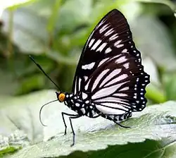 C'est un très grand papillon de couleur marron à noir aux antérieures ornées de blanc sous forme de longues taches entre les nervures, alors que les postérieures sont blanches avec les nervures marron ou noir. Antérieures et postérieures sont bordées d'une bande marron ou noir à ligne de petite taches. Ses yeux sont jaune doré.