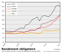 La crise de la dette publique à partir de 2010 dans la zone euro met en lumière l'extrême disparité des situations des finances publiques des États membres de la zone euro. Déficit public, dette publique, croissance du PIB, contexte politique et notation financière des États influent sur le rendement des obligations d’État. L'obligation « de référence » de la zone euro, le Bund allemand à dix ans, a par exemple en novembre 2011 un rendement inférieur à 2 %, alors que le rendement de l'obligation italienne à dix ans dépasse les 7 %[8], et celui de l'obligation grecque à dix ans a atteint des niveaux qui ne permettent plus à la Grèce de se financer sur le marché obligataire devenu pour elle totalement illiquide depuis 2010 concernant les échéances de moyen-long terme (la Grèce ne trouve plus d'acheteurs que pour ses obligations de très court terme ; ainsi en 2012, elle emprunte seulement sur des échéances à trois mois ou à six mois, à des taux dépassant les 4 %[9],[10]).
